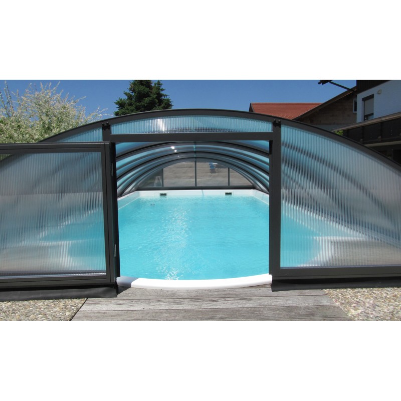 La forme arrondie capte en permanence les rayons du soleil et la surface vitrée chauffe votre bassin dès les premieres heures de la journée. L'ouverture centrale vous permets de profiter de la baigande quand il y a du vent. Grâce à sa hauteur cet abri laisse pour vous la vue degagée de votre jardin.