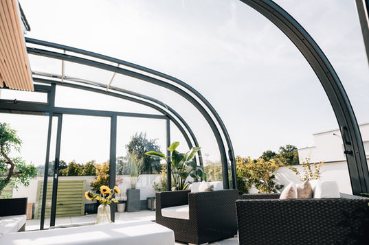 Grâce à la construction particulière et à la transparence de nos abris, même les rayons de soleil les plus faibles en hiver suffisent à réchauffer l’intérieur. En été, il suffit de faire coulisser les éléments de la toiture pour se détendre en plein air.